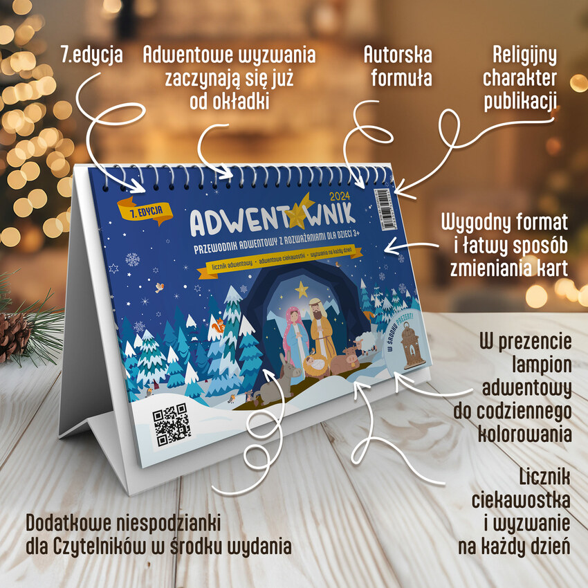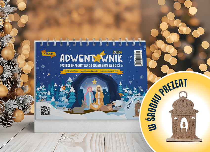 • PONADTO tegoroczna grafika okładkowa nawiązuje do nocy Bożego Narodzenia – przenosimy się do stajenki, w której urodziła się Boża Dziecina. Adwentowe wyzwania zaczynają się już od samej OKŁADKI – zapraszamy dzieci, aby policzyły poszczególne obrazki znajdujące się na okładce