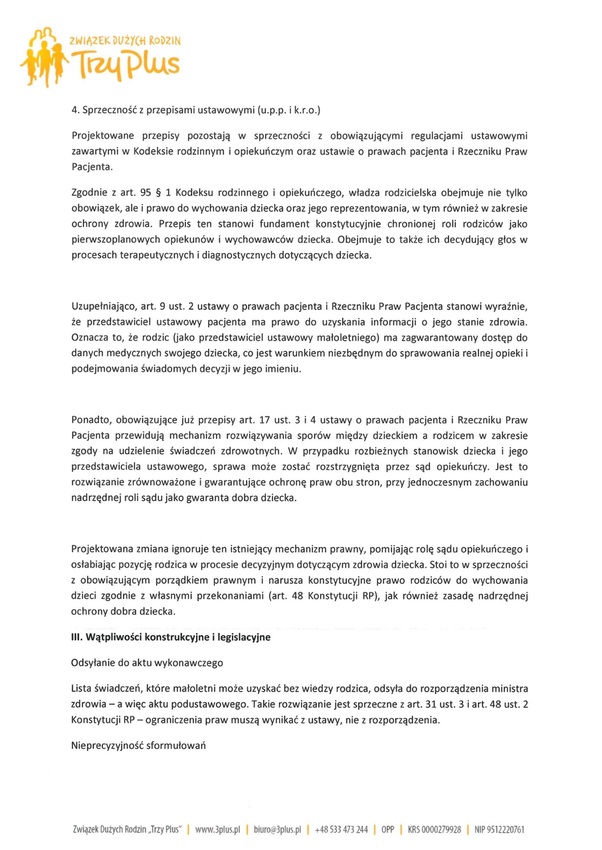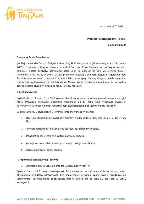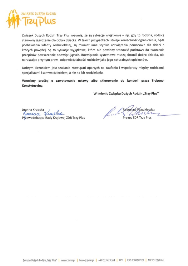 Kliknij, aby przeczytać pełne stanowisko Związku Duzych Rodzin Trzy Plus w tej sprawie → pismo do Prezydenta RP