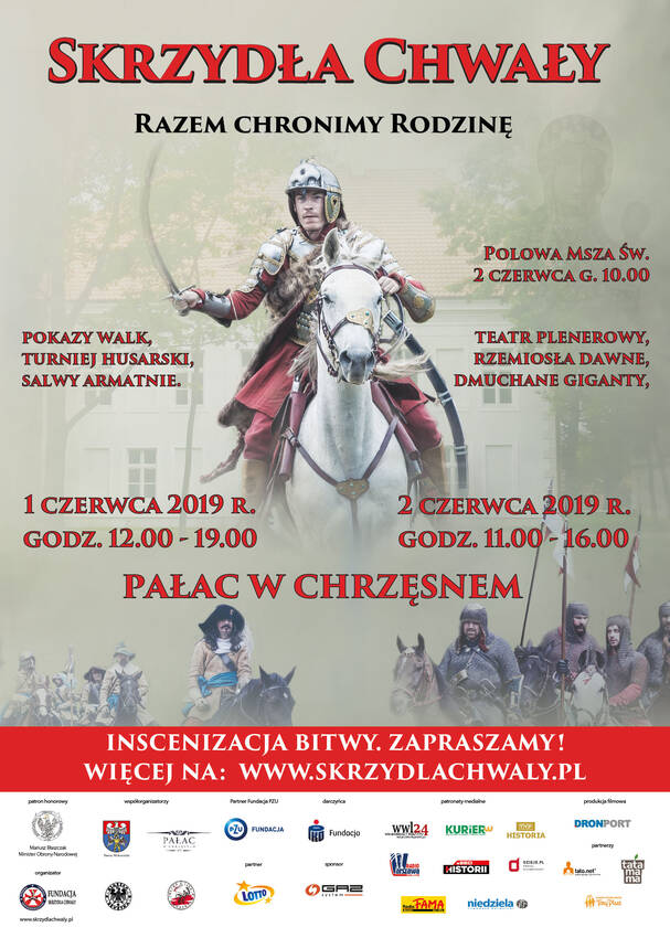 III edycja „POLSKA - SKRZYDŁA CHWAŁY. Razem chronimy Rodzinę” tym razem odbędzie się w dniach 1 – 2 czerwca 2019 r. na terenie Zespołu pałacowo-parkowego w Chrzęsnem, powiat wołomiński, który zmieni się w pole XVII w. potyczek i utarczek zbrojnych!