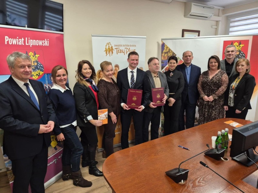 Dziś w siedzibie Starostwa Powiatowego w Lipnie odbyło się podpisanie porozumienia pomiędzy Powiatem Lipnowskim a Związkiem Dużych Rodzin „Trzy Plus” dotyczącego współpracy oraz organizacji ogólnopolskiego wydarzenia promującego wsparcie rodzin wielodzietnych na poziomie lokalnym i krajowym. Wydarzenie odbędzie się w dniach 12–14 czerwca 2026 roku, będzie trzydniowe i stanie się czasem wspólnego świętowania, integracji oraz licznych atrakcji dla rodzin.