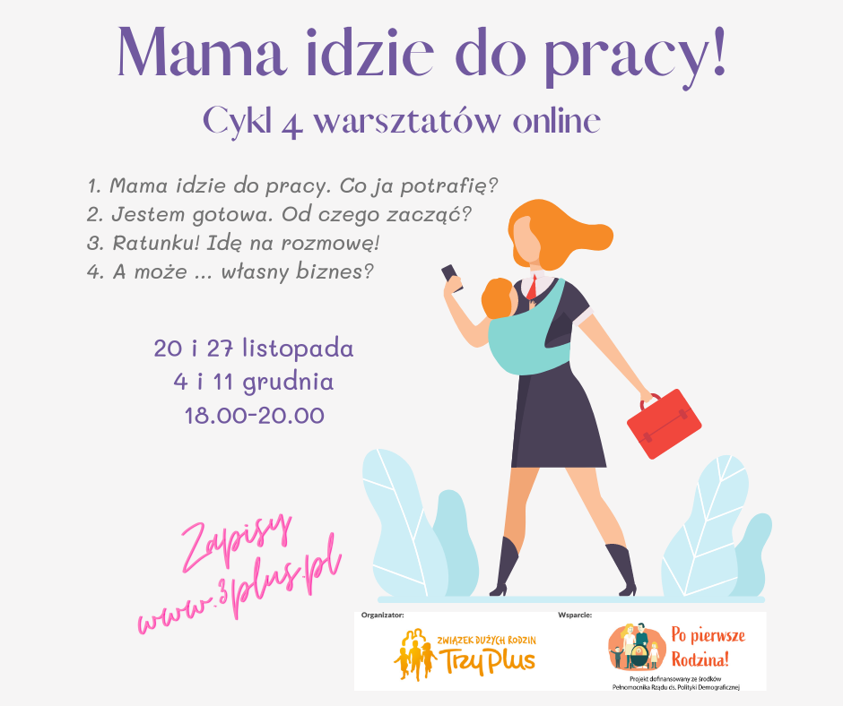 Planujecie wrócić do pracy? A może jesteście na początku Waszej drogi na rynku pracy zawodowej? Zapraszamy Was do udziału w cyklu 4 spotkań warsztatowych MAMA IDZIE DO PRACY - online, w dogodnych dla Was warunkach spotkania. Nie martwcie się pandemią - warto wykorzystać ten czas na przemyślenia i zaplanować swoją przyszłość. Zapisy na warsztaty - poniżej w linku.